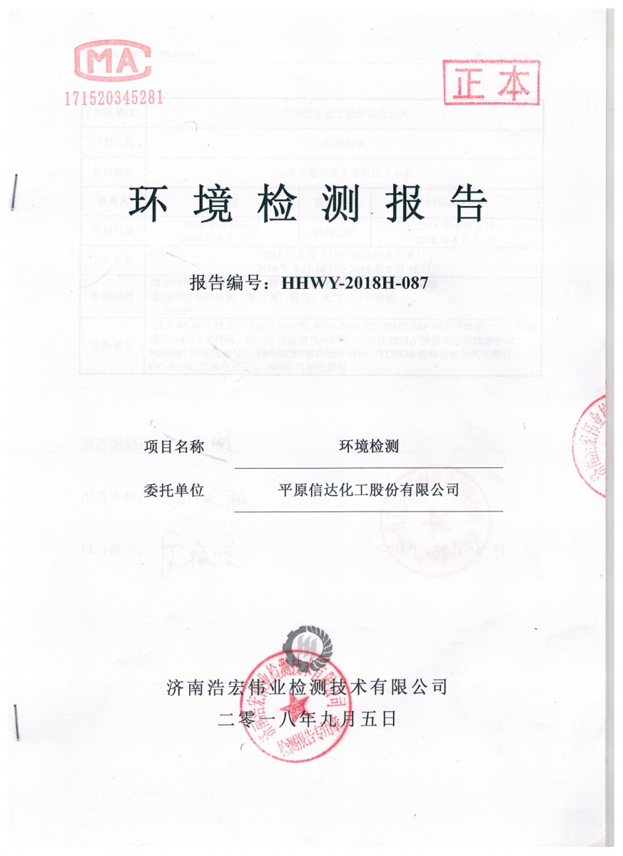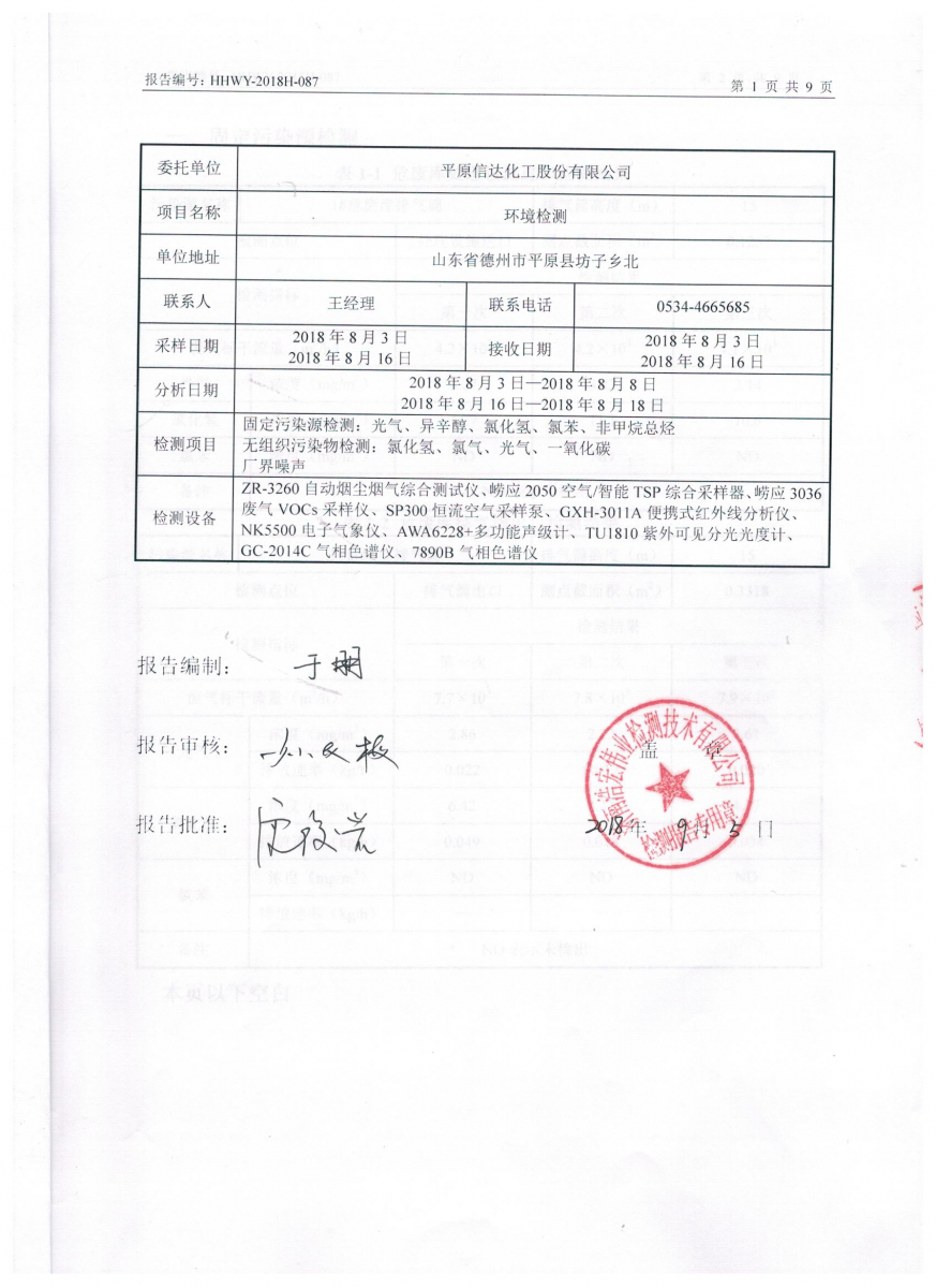 为确保污染物防治设施正常运转,污染物稳定达标排放,依据《中华人民共和国大气污染防治法》的相关规定对我公司生产过程中排放的VOCs和粉尘进行第三季度的常规性检测.为此我公司委托有资质的第三方环境检测机构(济南浩宏伟业检测技术有限公司)进行检测,并出具检测报告.